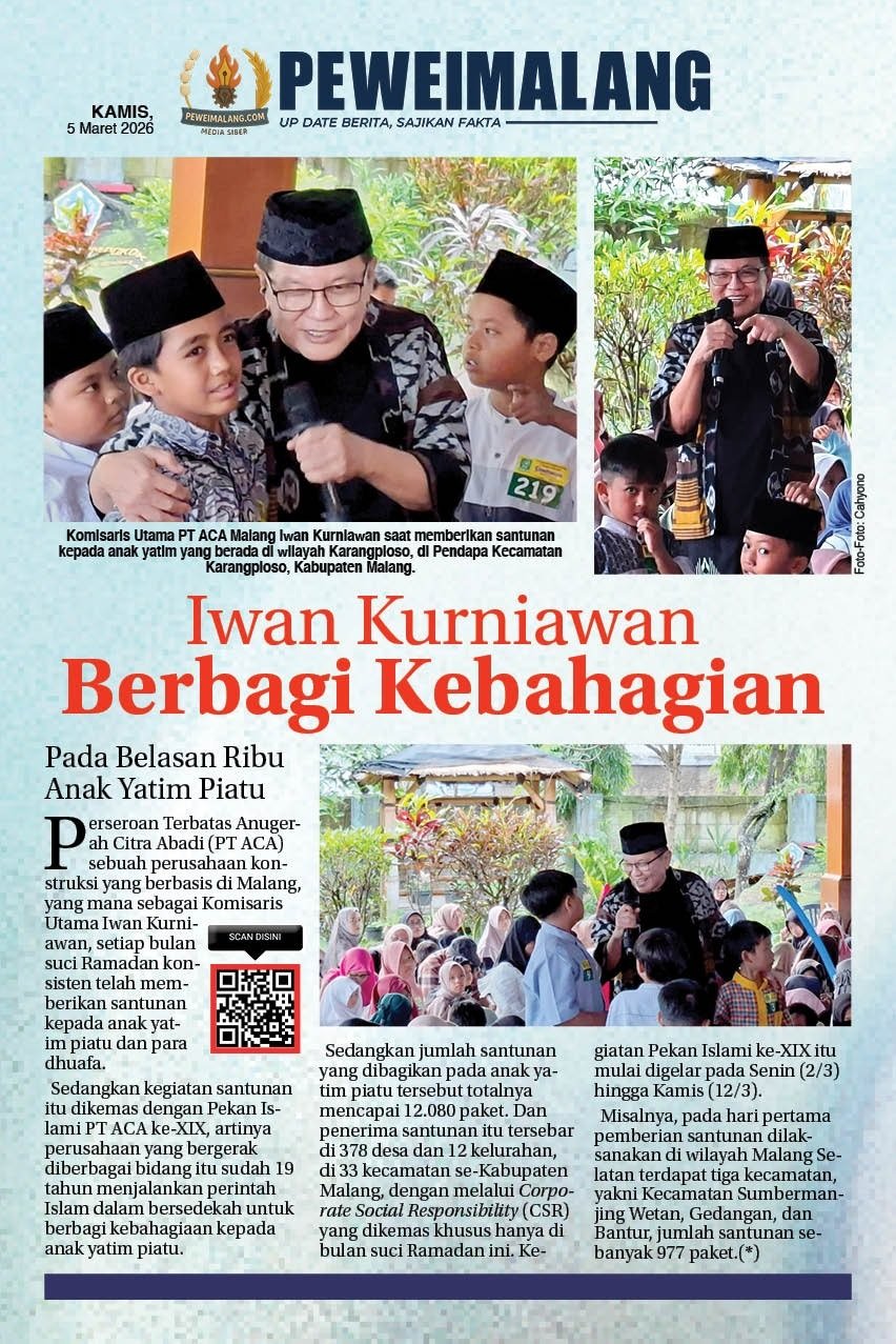 Peweimalang.com, Kabupaten Malang – Komisaris Utama Perseroan Terbatas Anugerah Citra Abadi (PT ACA) Iwan Kurniawan, di setiap bulan suci Ramadan terus konsisten memberikan santunan kepada anak yatim piatu dan para dhuafa. Kegiatan pemberian santunan tersebut dikemas dengan tajuk ‘Pekan Islami PT ACA ke-XIX’, artinya perusahaan yang bergerak diberbagai bidang itu sudah 19 tahun menjalankan perintah […]