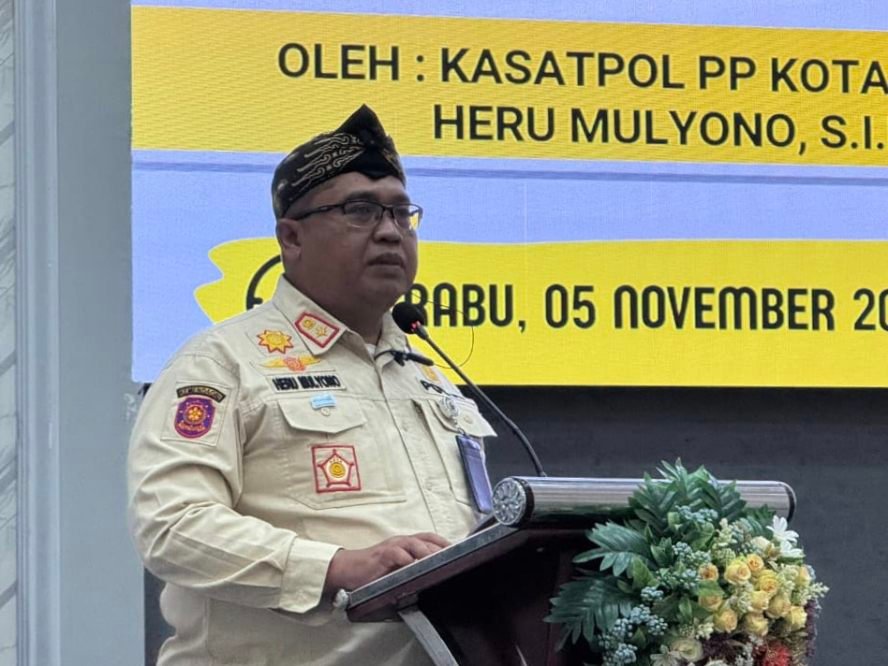 Kasatpol PP Kota Malang Heru Mulyono saat memberikan sambutan pembukaan Sosialisasi Ketentuan di Bidang Cukai dalam rangka Gempur Peredaran Rokok Ilegal yang menyasar Satuan Perlindungan Masyarakat (Satlinmas) Kota Malang. Kegiatan berlangsung di Hotel Aliante, Rabu (5/11/2025).