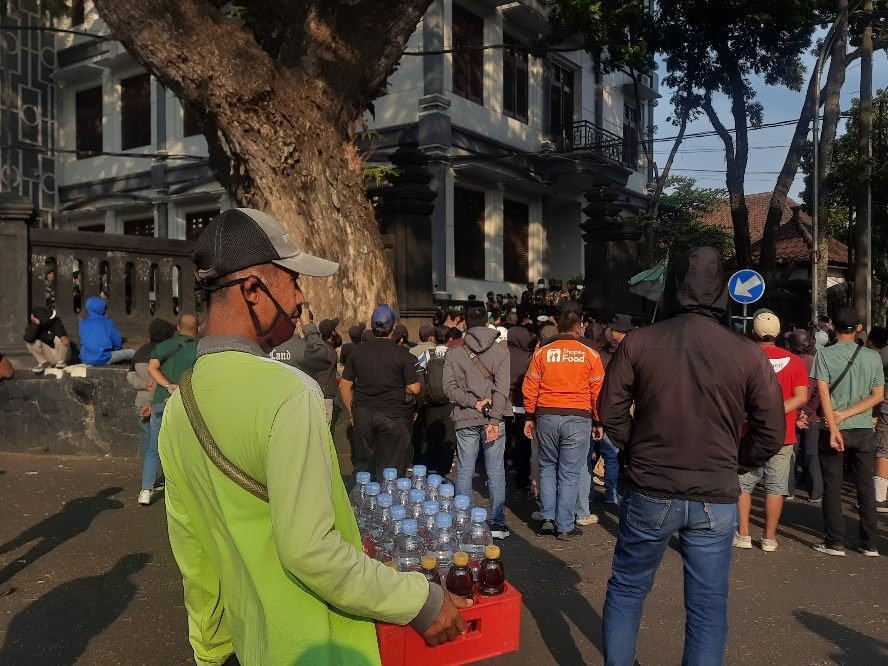 Demonstrasi ini digelar sekitar pukul 15.00 WIB di depan Gedung DPRD Kota Malang. Terlihat, Ainul berkeliling menghampiri setiap demonstran dengan menawarkan air minum dagangannya.
