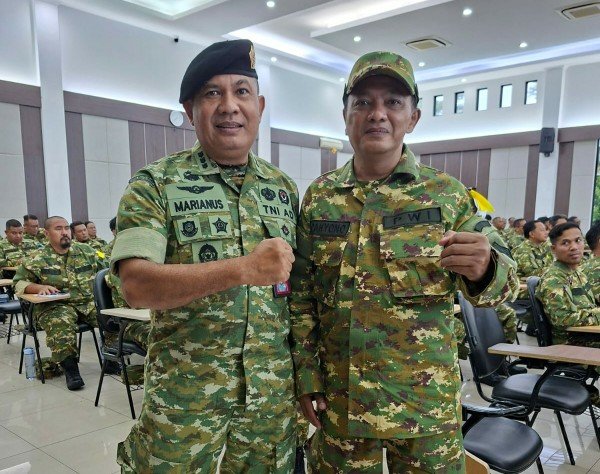 Ketua PWI Malang Raya Cahyono (kanan) bersama Kolonel (Arh) Marianus Susanto (kiri) Pelatih Pusdik Kompetensi Bela Negara, Bogor, teman kuliah satu jurusan dan satu angkatan di ITN Malang.