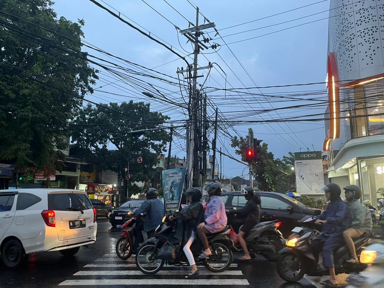 Di pertigaan Dinoyo, terlihat banyak kabel yang semrawut. (Agung Budi)