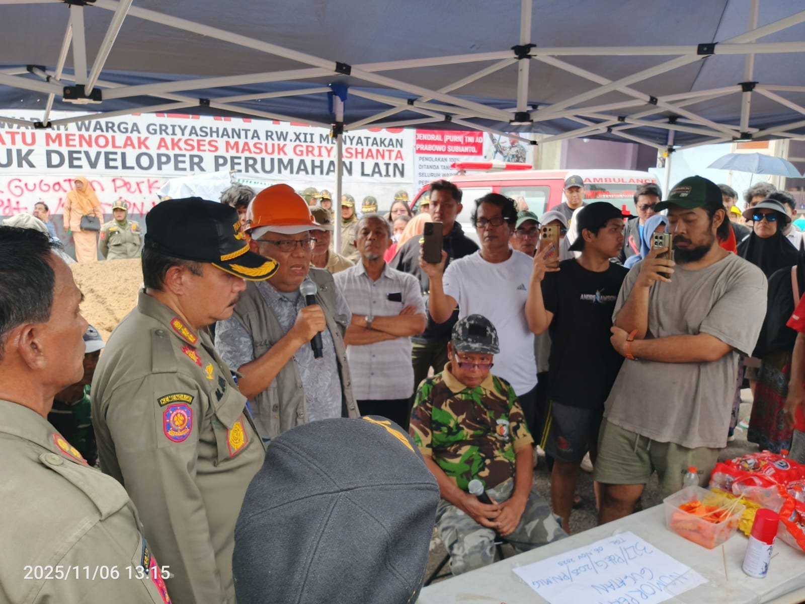 Sejumlah warga tersebut membentangkan banner penolakan jalan tembus. Warga juga berdatangan untuk menahan para anggota Satpol PP yang sudah datang melalui pintu sebelah Barat tembok perumahan.